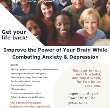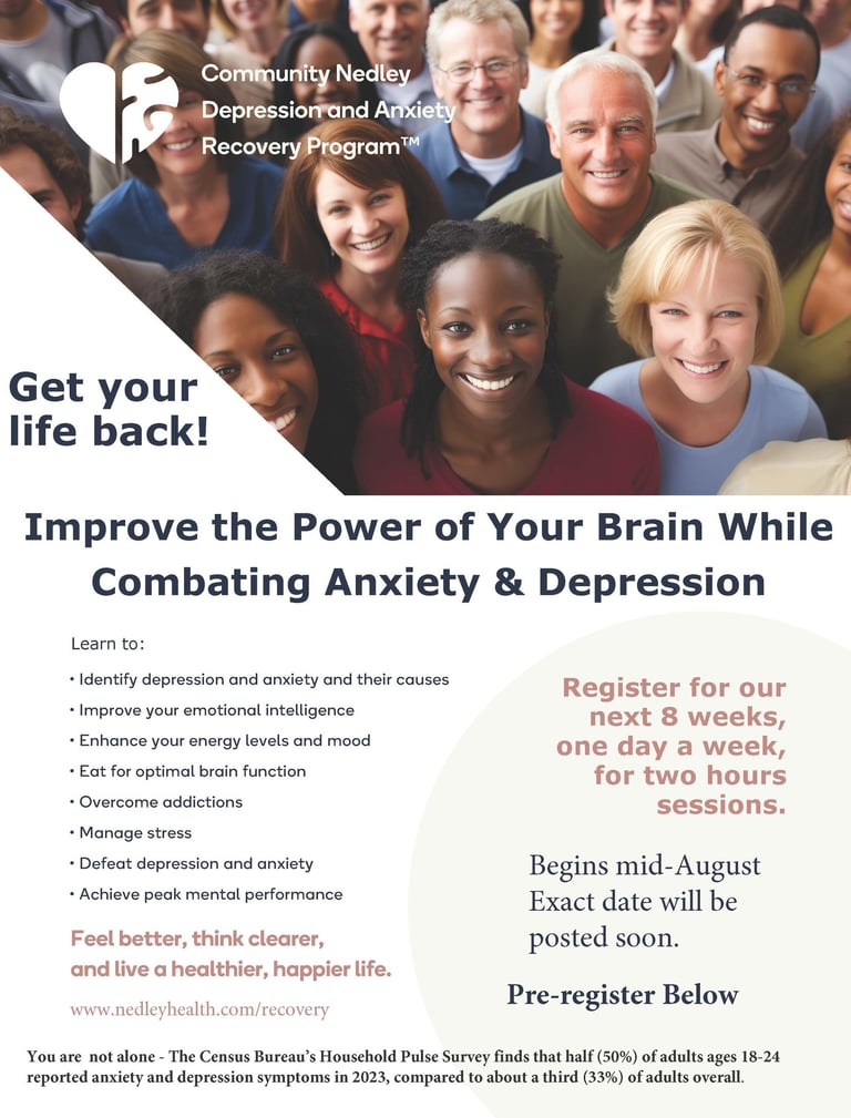 You are not alone! The community Nedley Depression and Anxiety Recovery Programâ„¢ identifies the underlying causes of depression and anxiety so that lasting cures can be found. Discover evidence-based information, practical interventions, useful tools, supportive volunteer staff, and group accountability as you engage in this community health education course. Thousands have successfully improved overall mental performance, memory, concentration, sleep, and relationships through this program.